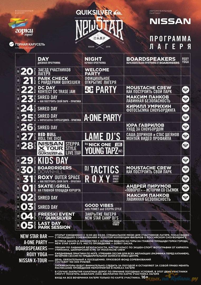 В горах Сочи, на территории всесезонного курорта "Горки Город" и спортивно-туристического комплекса "Горная карусель", 20 марта открылся сноубордический лагерь Quiksilver New Star Camp 2015.