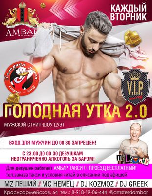 | Понедельник | Вторник ГОЛОДНАЯ УТКА 2.0 Специальный подарок для всех девушек МУЖСКОЙ СТРИПТИЗ