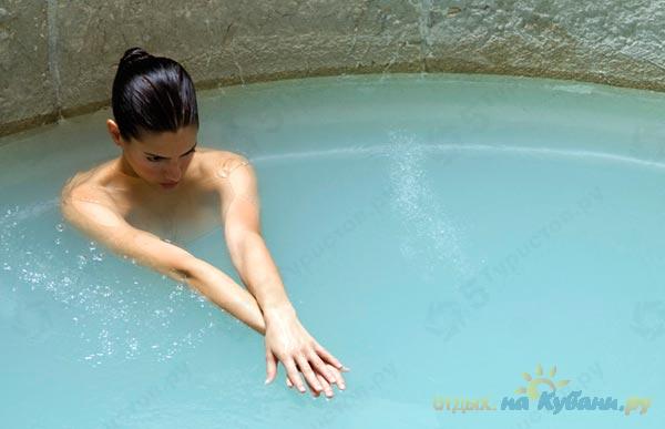Ванны с теплой природной водой расслабляющее действуют на психику, в результате чего исчезают болевые ощущения, расслабляются мышцы, снижается артериальное давление и вместе с тем поднимается настроение.Лечение, основанное на термальных водах, используют, например, здесь: