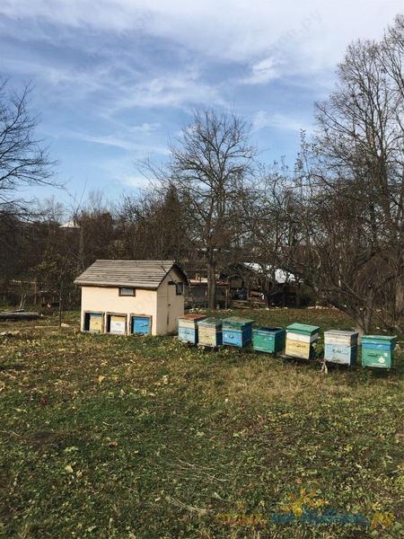 Пчелиный домик: 3 пчелиных улья расположены летками на улицу, сверху ульев, внутри домика есть деревянная лежанка, пчел в домике нет.