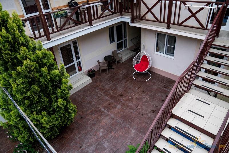 Территория оборудована всем необходимым для комфортного отдыха. Двор озеленен, есть тенистые места для отдыха со столами и стульями, качелями. Маленьким гостям также не придется скучать - во дворе имеется оборудованная детская площадка с игрушками, качелями и горкой.