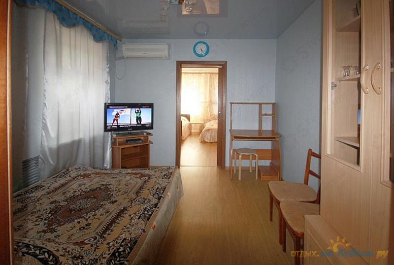 В изолированной комнате: двуспальный раскладной диван, односпальная кровать, трельяж, шкаф. В проходной: двуспальный раскладной диван, ЖК-телевизор, спутниковая ТВ, сплит-система, Wi-Fi, шкаф. Отдыхающие могут воспользоваться кухней и стиральной машиной.