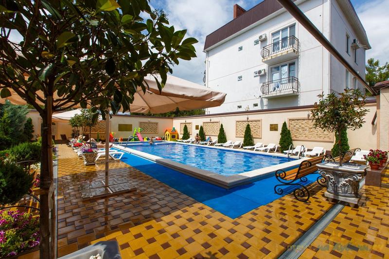 У гостиницы есть просторный двор с бассейном, детской площадкой, двумя большими беседками и местами для отдыха, очень уютный и зеленый.
