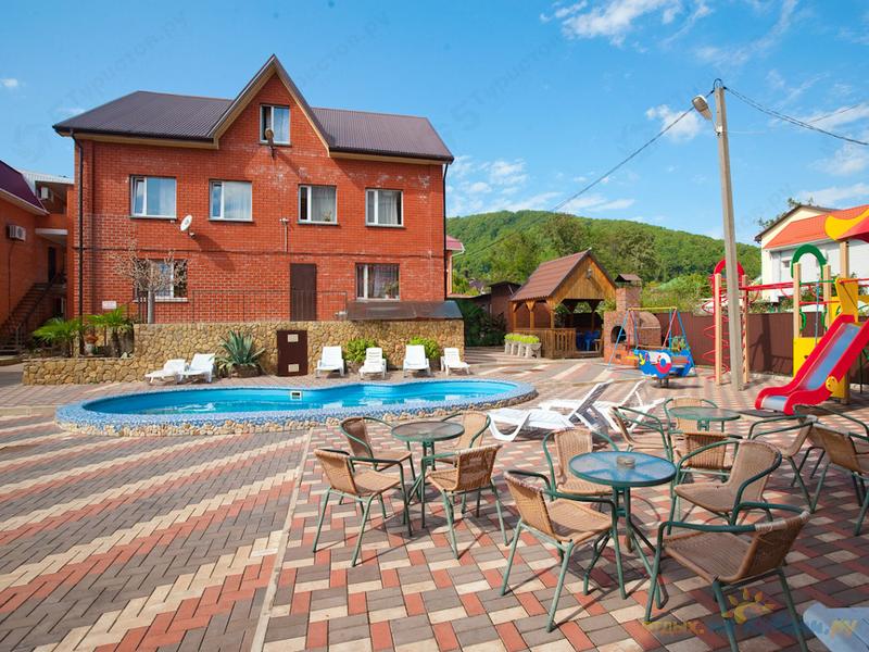 Гостевой дом – это настоящее уютное гнездышко с благоустроенной территорией, утопающей в зелени, бассейном с морской водой, кафе и автостоянкой.