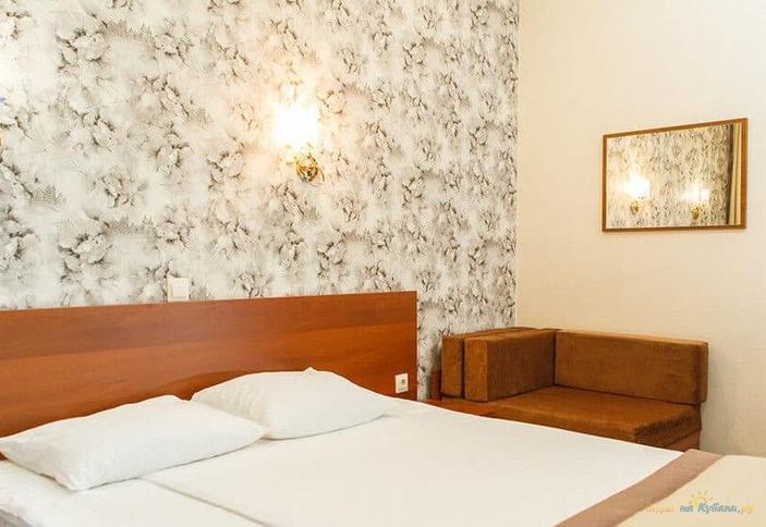 Комфортабельный номер с одноместным размещением. В номере: двуспальная кровать, прикроватные тумбы, шкаф-купе, стол, два стула, обувница, вешалка для одежды в прихожей, набор посуды, полотенца, гигиенические принадлежности; мини-бар (по желанию гостей и за доп. плату).