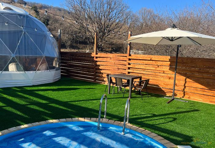 Удобства в комнате: сплит-система, собственный бассейн, отдельный вход, ламинат, журнальный столик, кресло-кровать, плотные шторы, рядом с бассейном, пододеяльники, столовые приборы, стулья, умывальник, двуспальные кровати, полотенца включены