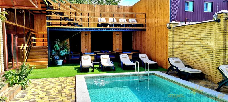 Во дворе дома есть бассейн, где Вы можете принять солнечные ванны или просто окунуться в бассейн. Расположение дома в спальном районе гарантирует Вам спокойный отдых без посторонних шумов. Так же Вы сможете отдохнуть в тени беседки. На территории гостевого дома оборудовано две кухни со всем необходимым для самостоятельного приготовления пищи.