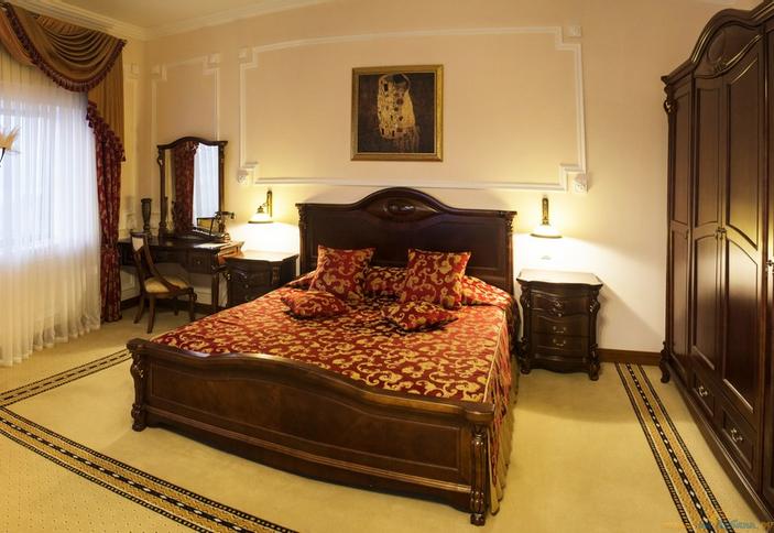 - Спальня с шикарной двуспальной кроватью и прикроватными тумбами, вместительным шкафом для одежды, трюмо с зеркалом, журнальным столиком, полукреслом, тумбой, плазменным телевизором, телефоном и мини-сейфом.