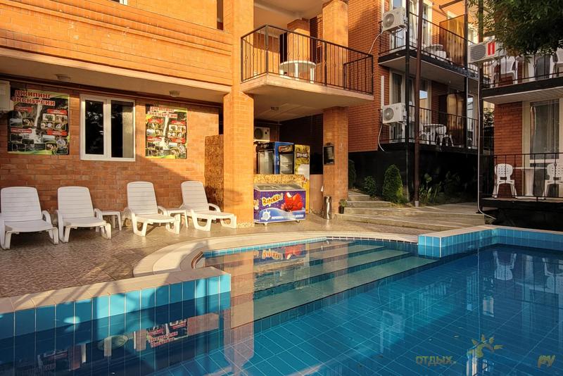 Дом подходит для комфортного семейного отдыха, так и для больших компаний. На территории кухня, мини-бар, зона отдыха с шезлонгами у бассейна, зона барбекю, экскурсионная стойка, парковка, прачечная, доступ к интернету Wi-Fi. Номера класса комфорт со всеми удобствами. Есть несколько типов: однокомнатные номера (двух-, трехместные), двухкомнатные номера, трехкомнатные номера. В номерах душ, в некоторых даже ванная, туалет, кондиционер, ТВ, холодильник, Wi-Fi. Все номера с балконами. Двухкомнатные и трехкомнатные номера с шикарным видом на море.