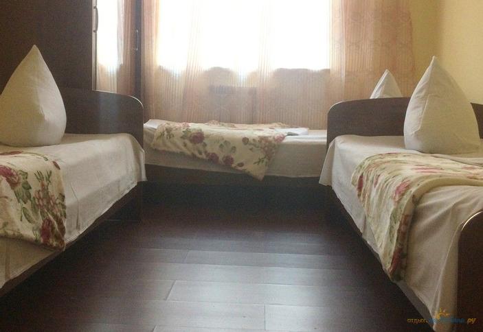 В номере три кровати, шкаф, тумбочки, телевизор ЖК, кондиционер. На этаже душ туалет. Всего 6 номеров, на каждые три номера, душ, туалет, умывальная.