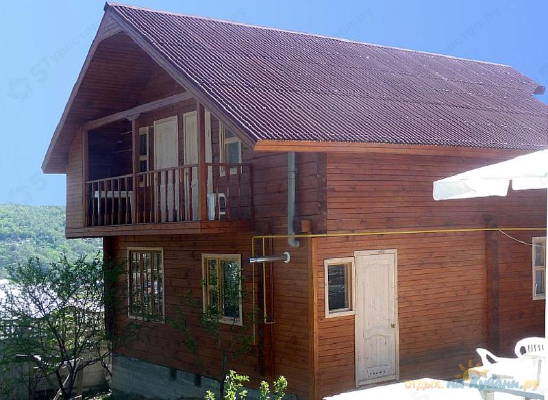 Двухэтажный дом, органично вписаный в горный ландшафт, построен из профилированного массива бруса. Дом окружен фруктовым садом, имеет свой выход в дубовый лес и фантастический вид на море.