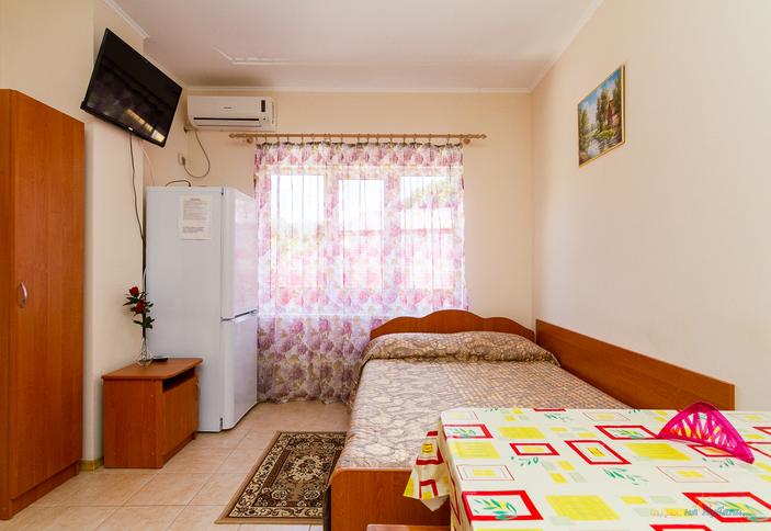 Номер находится в гостинице, стоящей на берегу моря (30 метров от пляжа). Окна номера выходят во двор. Номер оснащен кухней, санузлом, кондиционером, спутниковым ТВ, Wi-Fi. Близость к морю и уникальное местоположение создает оптимальный микроклимат для вашего отдыха.
