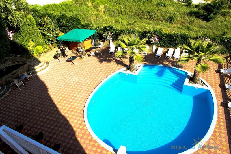 также есть собственный бассейн диаметром 8 м, кафе, бар, мангал, сауна,