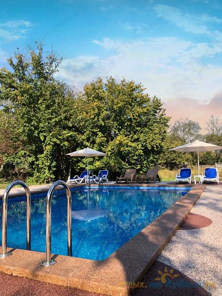 Рядом расположена крытая зона барбекю с принадлежностями и посадочными местами для отдыха. Далее, ближе к лесу, за домом и зоной барбекю расположена баня на дровах и прилегающий к ней открытый бассейн с подогревом в режиме круглый год, температура в холодное время года поддерживается не ниже 22 град., размер 5х8х2 м. Вокруг бассейна – зона для отдыха, загара, противоскользящее покрытие "каменный ковер", установлены шезлонги, зонты от солнца. Рядом с бассейном установлен банный чан на дровах вместимостью 8 человек.