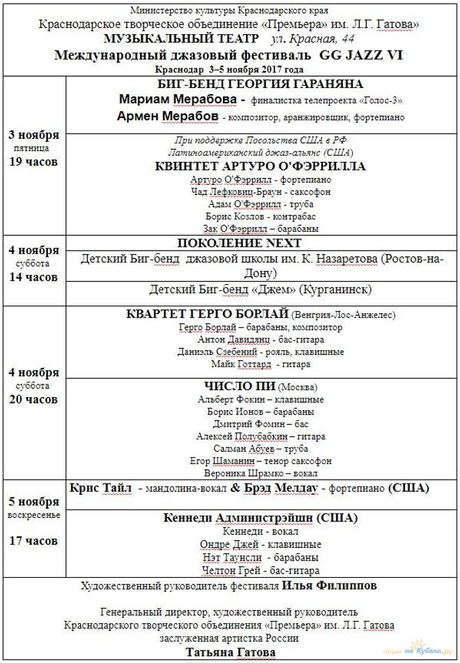 Хедлайнером предстоящего мероприятия выступит Квинтет Артуро О'Фэррилла (пятикратного обладателя премии "Грэмми" джазового пианиста). Выступление в Краснодаре пройдет при поддержке Посольства США в РФ.