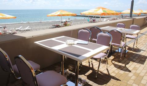 Меню кафе с летней площадкой базируется на блюдах европейской и кавказской кухни. Здесь можно утолить жажду после принятия солнечных ванн и купания. В меню имеется разнообразие алкогольных и безалкогольных напитков, свежевыжатых соков. Фирменные рыбные, мясные блюда от шеф-повара, салаты, закуски, свежие фрукты порадуют вас своим изобилием.