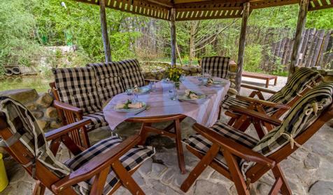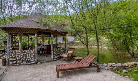 Беседка расположена между двух озер. Вместимость — до 10 человек.