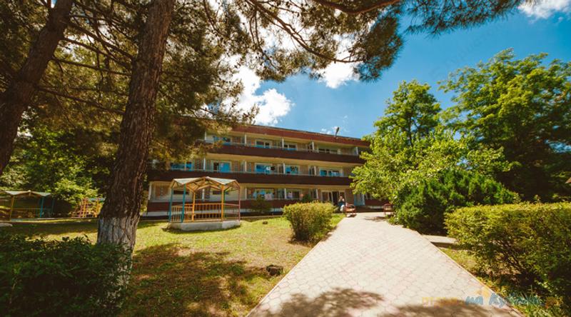 Территория пансионата большая, занимает почти 8 га земли, что позволяет разделить ее на две зоны: отдельно стоящий пятиэтажный корпус для отдыхающих с детьми и отдельные корпуса для детей оздоровительного лагеря. В отдельном здании находятся клуб-столовая с киноконцертным залом.