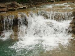 До следующего водопада 3,5 км пути. Это целый каскад из 4-х небольших водопадов общей высотой 10–11 м. В этом месте флишевые породы почти вертикально выходят на поверхность пластами, как будто гигантские перья на спине доисторического бронтозавра перегородили реку каменные зубья. И вода за долгое время изумрудными струями прочесывает эти зубья. Один из водопадов назвали Изумрудным, а расположенную ниже котловину – Чашей любви. Рядом уютно разместились цепочкой дивные поляны, где можно поиграть в подвижные игры, посидеть у костра, искупаться в речке.