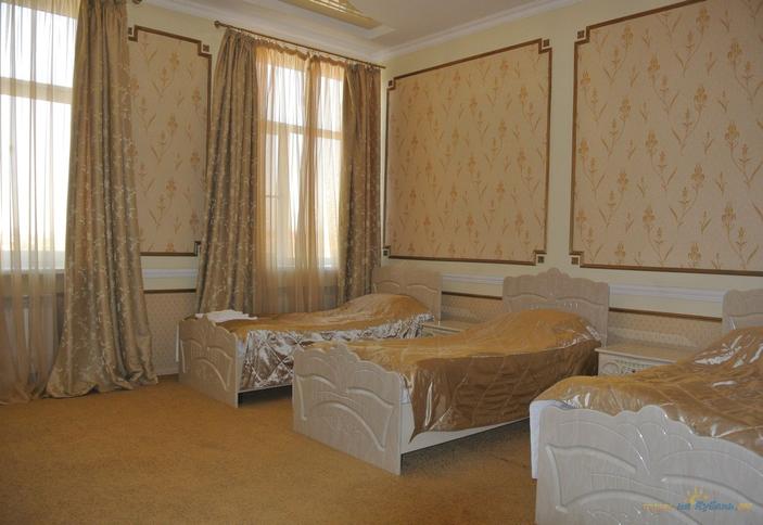 Стандартный трехместный номер. В номере: сплит-система, телевизор, холодильник, душевая кабина, джакузи, фен, махровый халат, тапочки, писчий набор, средства личной гигиены и индивидуального пользования, двуспальная кровать, балкон.