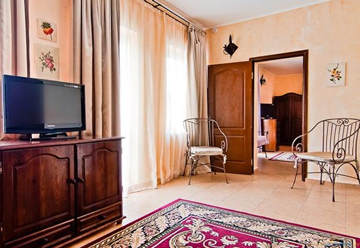 Комфортабельный двухместный двухкомнатный номер со всеми необходимыми условиями для отдыха. В номере: мебель (диван раскладной, кресла, кровать двуспальная, пуфик, столик журнальный, столик туалетный, тумба багажная, шкаф), оборудование (гладильная доска, мини-холодильник, набор посуды, сейф, сплит-система, два ЖК- телевизора), телефон, утюг, электрочайник) Санузел с ванной, с джакузи: джакузи в основной комнате.