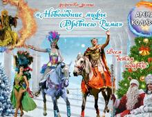 В Новый Год яркие впечатления, веселые игры и многочисленные сюрпризы вам подарят герои красочного шоу: прекрасные амазонки, нимфы, гладиаторы, повелители огня, царица Египта Клеопатра, Великий Цезарь, великолепные лошади мировых шоу от Андалузских до Арабских скакунов и, конечно, же Дед Мороз и Снегурочка.