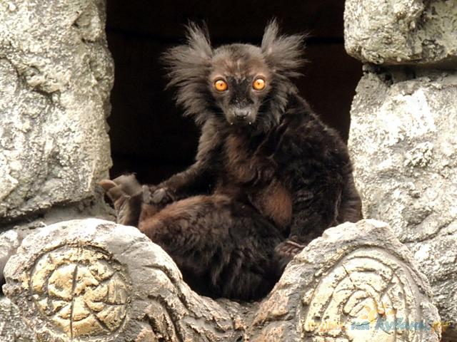 Все лемуры выходцы из Мадагаскара. Самки и самцы черного лемура окрашены по разному. Самцы – в однотонный черный, самки светлее, и брюхо у них светлое.