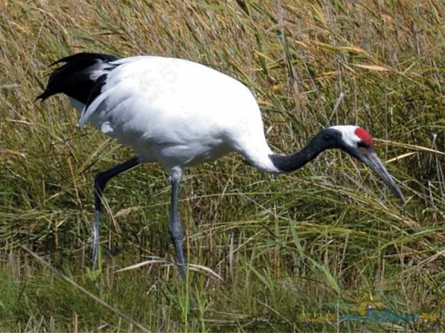 Один из самых крупных и красивых журавлей, его рост составляет около 160 см, а вес свыше 7 кг. Большая часть оперения, включая и кроющие перья крыльев – белые. У взрослых птиц в верхней и передней части головы перья отсутствуют, кожа в этом месте окрашена в ярко-красный цвет. От глаз к затылку и далее на шее имеется широкая белая полоса, которая резко контрастирует с шеей черного цвета. Считается священной птицей в Японии. Сильная и осторожная птица, и естественных врагов у него практически нет. Находится под угрозой исчезновения.