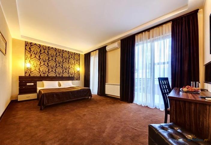 Однокомнатный номер, рассчитан на проживания семьи из пяти человек. Оформление номера в спокойных кофейно-фисташковых тонах позволит гостям окунуться в атмосферу расслабляющего и комфортного отдыха.