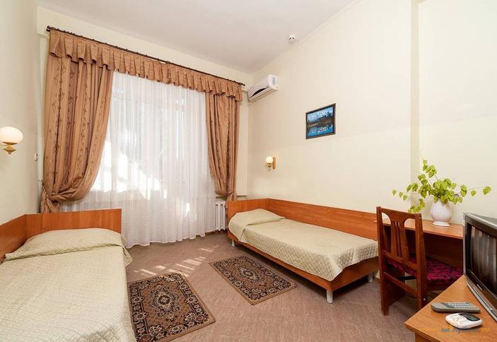 В номере: две кровати, диван, две тумбочки, туалетный столик, два стула, зеркало, встроенный плательный шкаф, телевизор, холодильник, кондиционер, балкон. Санузел совмещенный (душ, туалет, умывальник).