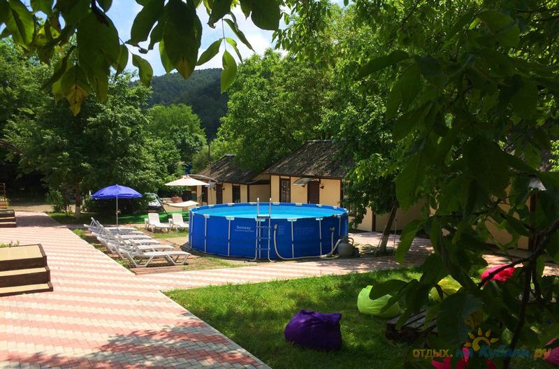 К услугам гостей: каркасный бассейн, терраса для загара, мангальные зоны, парковка для автомобилей, бесплатный Wi-Fi, лаундж - зона, качели и батут для детей. А также гостей порадует большая беседка с открытой обеденной зоной, общей кухней и баром, которая расположилась в тени деревьев, с видом на цветы и дивный пруд. Кроме того, до пляжа гостей довезет трансфер бесплатно и с комфортом (удаленность от моря - 2,5 км).