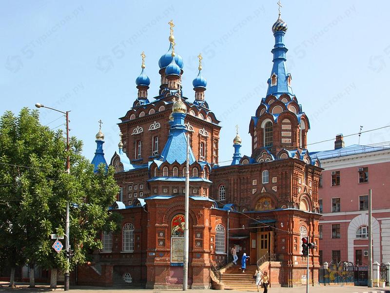 Над центральной частью пять классических куполов в виде луковиц, над притвором – колокольня, всего над храмом 11 куполов. Длина храмовой и алтарной части 26 метров, ширина 20 метров. Размер первого яруса колокольни 5,5 м. Фасады решены в одинаковых архитектурно-художественных приемах и раскрепованы пилястрами с ширинками на первом ярусе, трехчетвертными пучками колонн на втором и третьем ярусах. Оконные проемы имеют трехцентровые перемычки на галерее, двойные полуциркульные – на втором ярусе и прямоугольные с контрналичниками и сандриками в виде кокошников на третьем. Цветовое решение фасада выполнено из лицевого кирпича местного производства и цветных изразцов оригинальным и интересным способом.