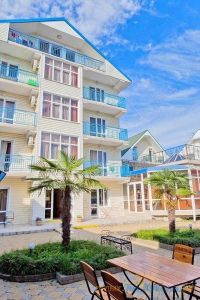 На территории мини-отеля есть кафе, размещенное во дворике. Маленький внутренний двор декорирован пальмами, скамьями и детскими качелями. Это место как нельзя лучше подходит для романтических пар и семей с детьми.