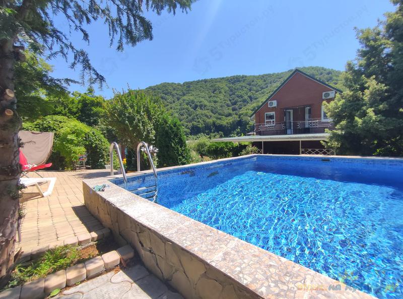 Чистый, ухоженный бассейн с прозрачной водой и шезлонгами разделяет двор как бы на 2 зоны, сразу за бассейном находится сад, в котором разместились уютный домики, из бруса и бревна. Экологически чистые, со своими террасами (верандами), каждый номер оборудован садовой мебелью, холодильником, телевизором, сплит-системой, электрочайником, сушилкой для белья, индивидуальным санузлом, горячая вода постоянно, нет шумных гремящих кондиционеров.
